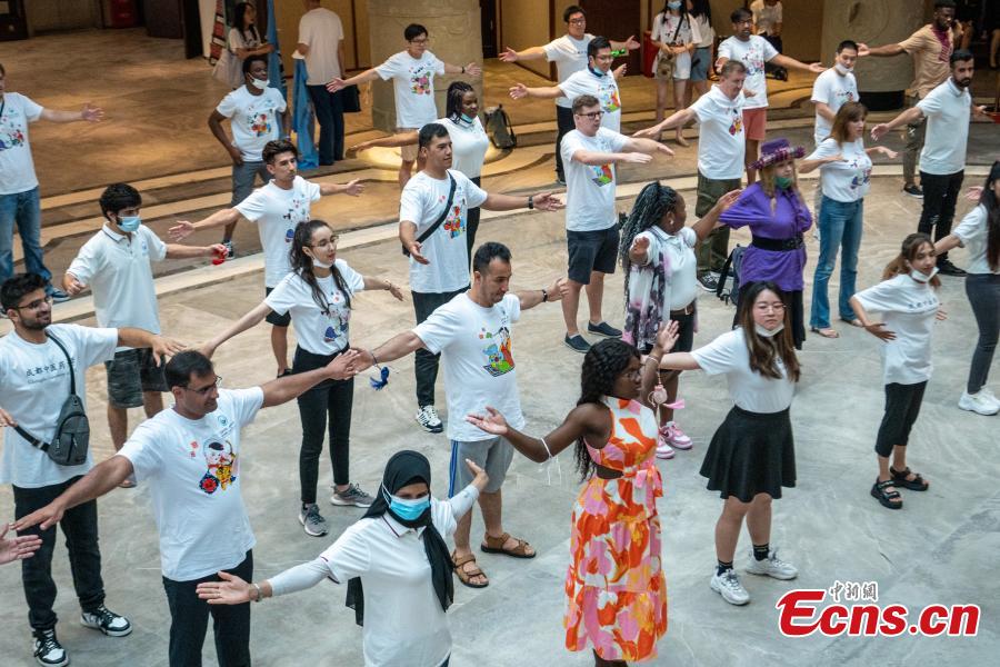 Foreigners practice Baduanjin during the Bashu themed cultural activity in Meishan city, southwest China's Sichuan Province, July 18, 2022. (Photo: China News Service/Liu Zhongjun)