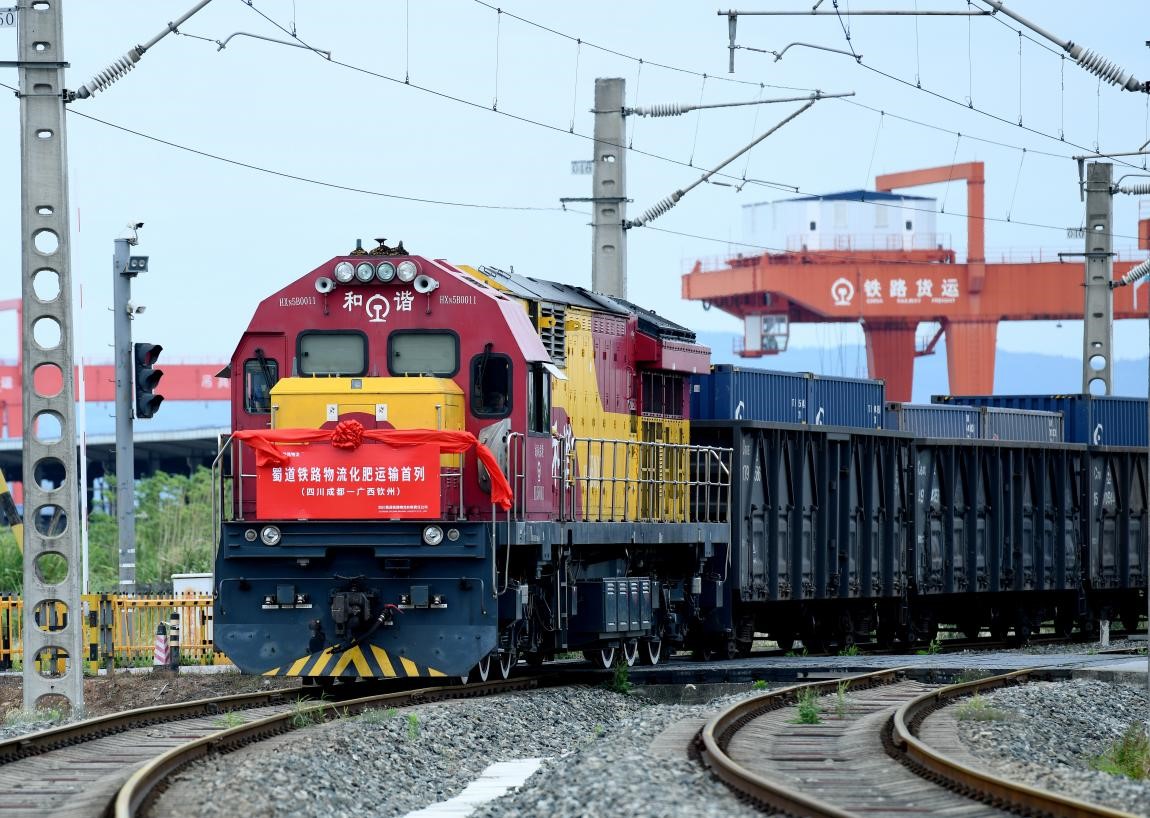 A freight train carrying fertilizers departs from Chengdu, southwest China's Sichuan province, May 27, 2022. The fertilizers are exported to Brazil along the New International Land-Sea Trade Corridor. (People's Daily Online/Hu Zhiqiang)