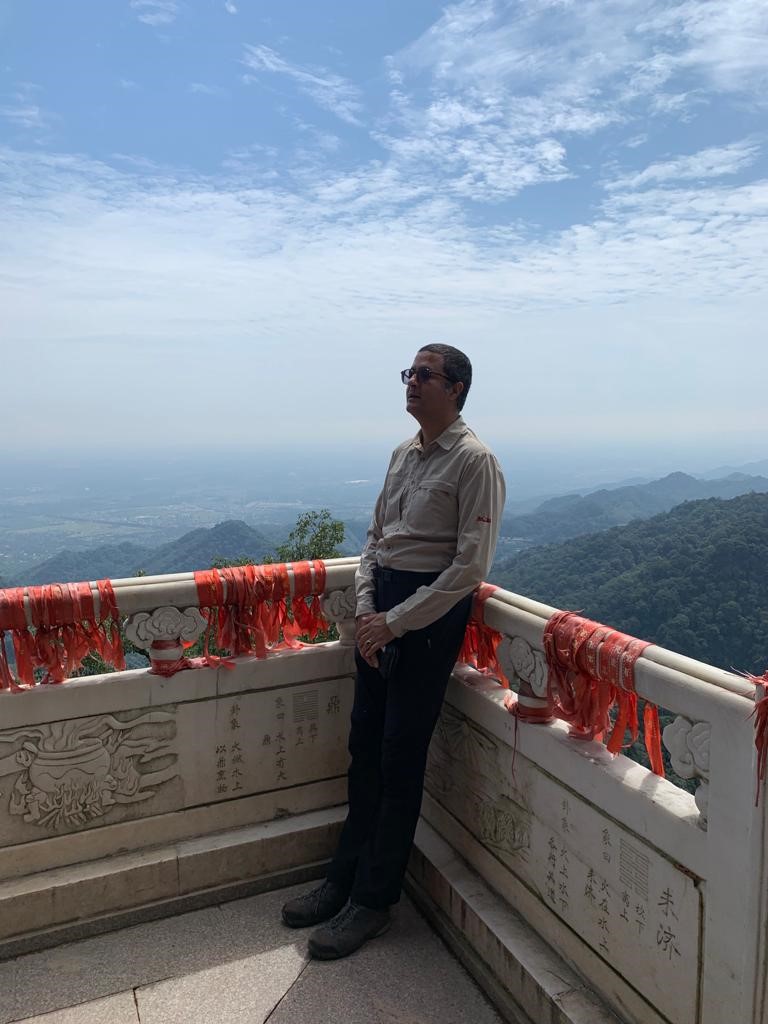 Bhaskar Koirala, the Director of Nepal Institute of International and Strategic Studies, visits the scenic spot of Qingcheng Mountain in southwest China’s Sichuan province in 2019. (Photo provided by Bhaskar Koirala)