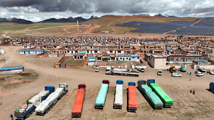 Aerial photo taken on July 13, 2022 shows trucks carrying furniture preparing to depart from Doima Township of Tsonyi County, southwest China's Tibet Autonomous Region. (Xinhua/Jigme Dorje)