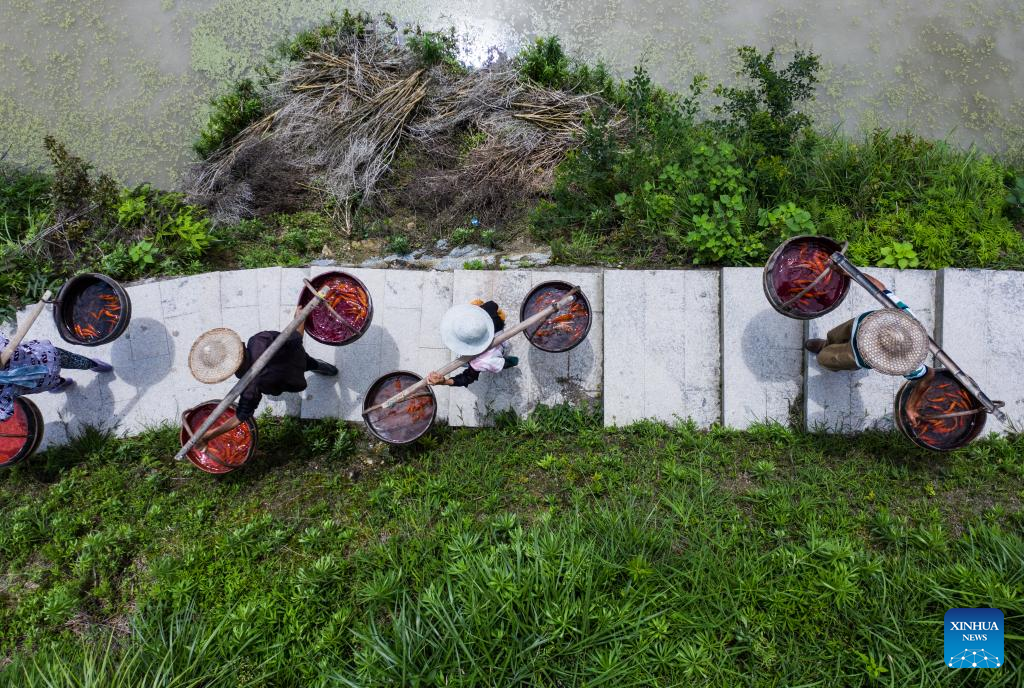 In this aerial photo, farmers carry buckets of fish fry before releasing them into rice fields in Xiaozhoushan Township, Qingtian County, east China's Zhejiang Province, June 11, 2020.