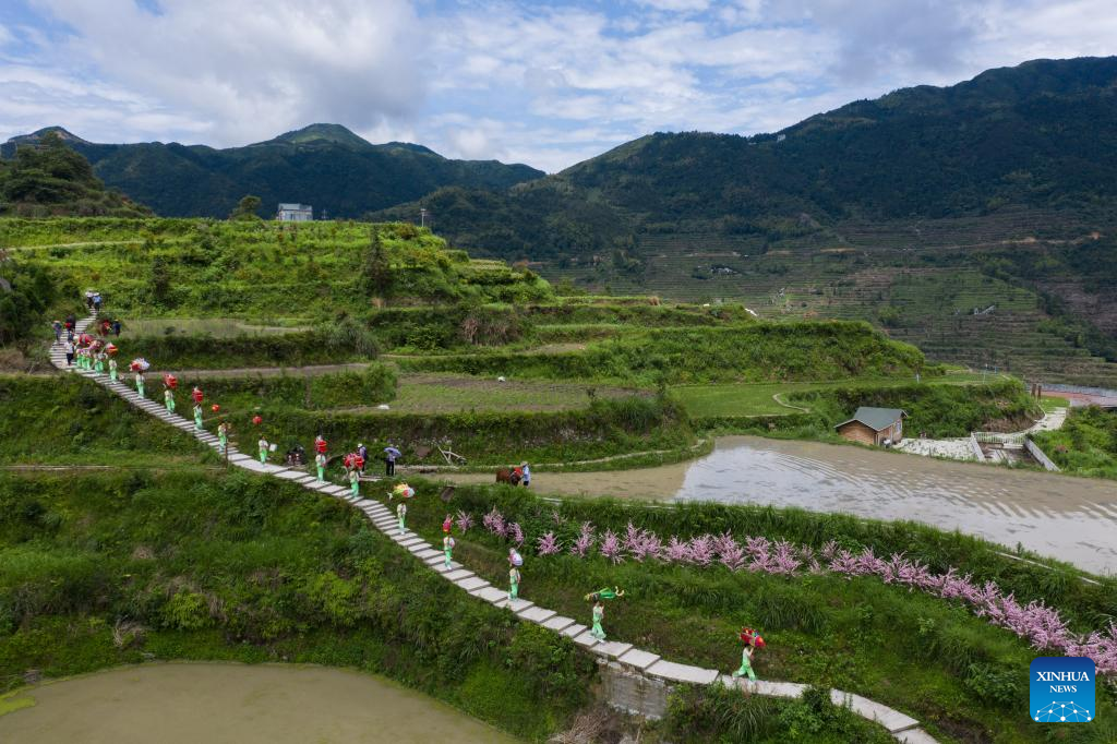 In this aerial photo, villagers celebrate in traditional costumes as they start ploughing and release fish fry into rice fields in Xiaozhoushan Township, Qingtian County, east China's Zhejiang Province, June 11, 2020.