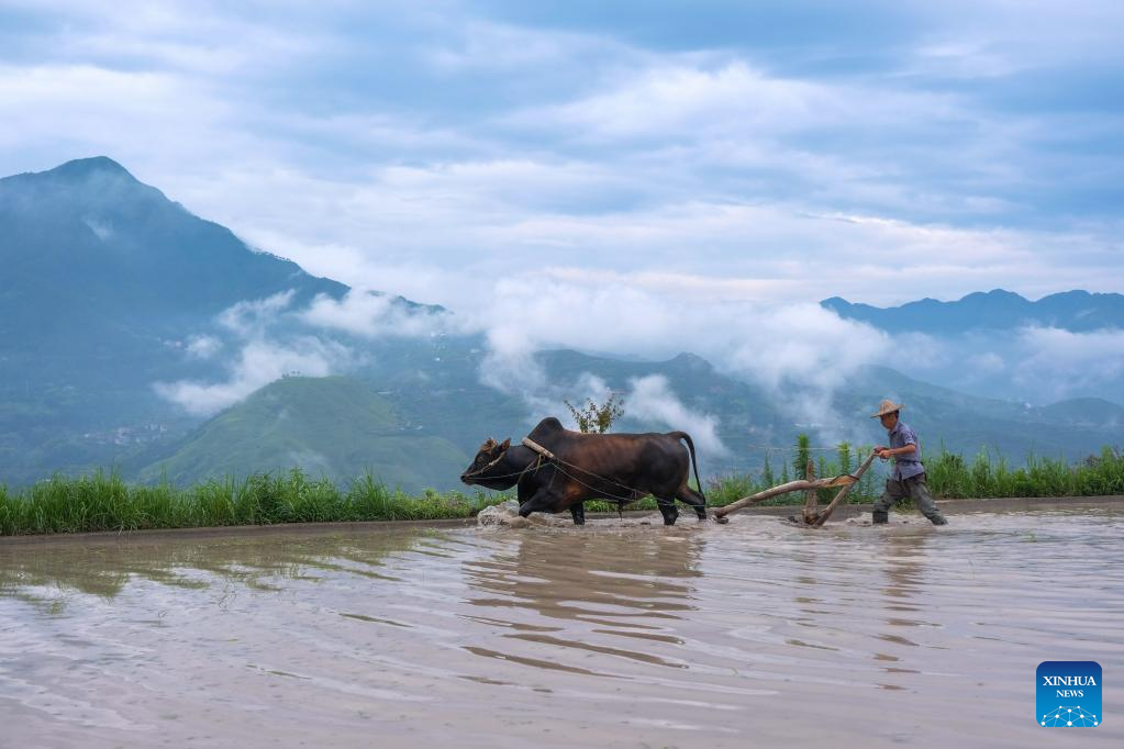A farmer plows the rice field in Xiaozhoushan Township, Qingtian County, east China's Zhejiang Province, June 11, 2020.