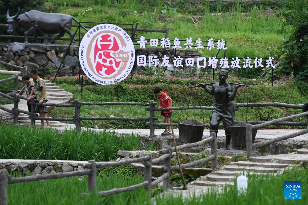 People visit a protection area of the rice-fish co-culture system in Qingtian County, east China's Zhejiang Province, July 18, 2022.