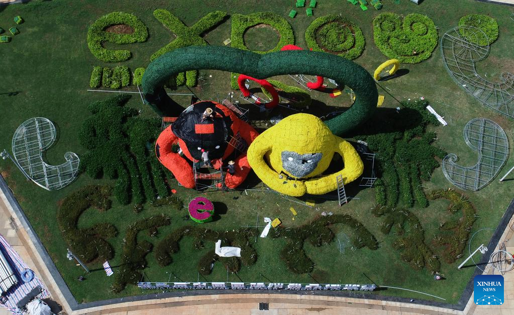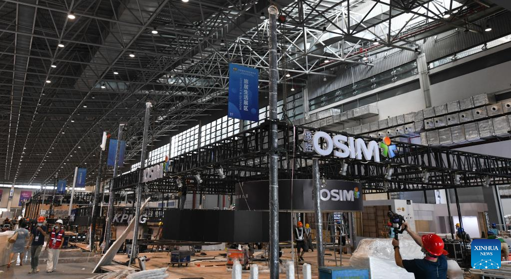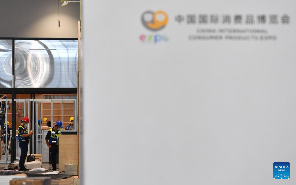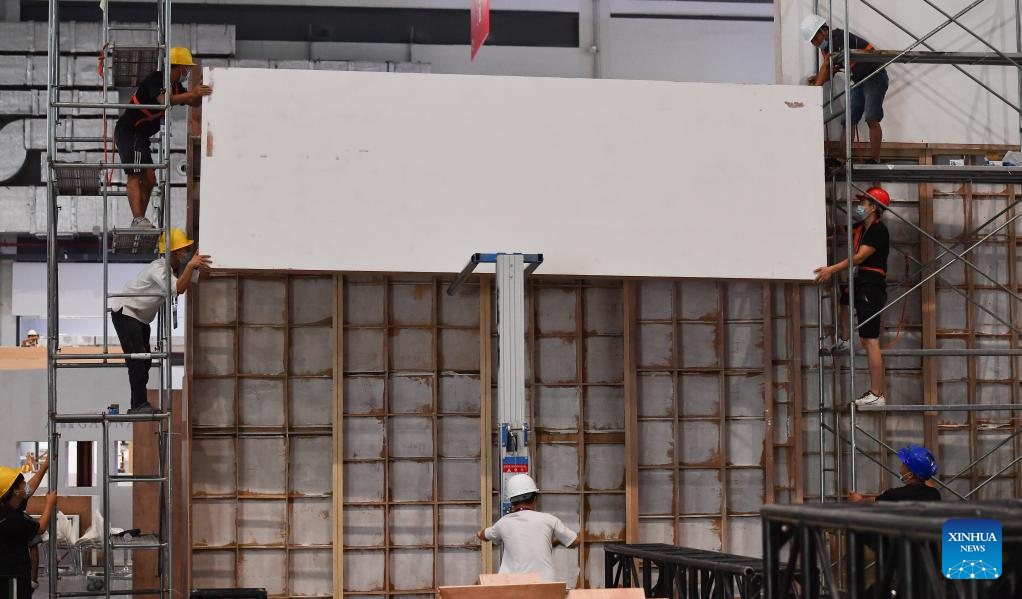 Workers set up exhibition booths at the Hainan International Convention and Exhibition Center, the venue for the 2nd China International Consumer Products Expo, in Haikou, south China's Hainan Province, July 19, 2022. The expo will be held in Haikou from July 26 to 30. The number of firms attending the expo will exceed last year's figure, with the exhibition area expanding to 100,000 square meters from 80,000 square meters.