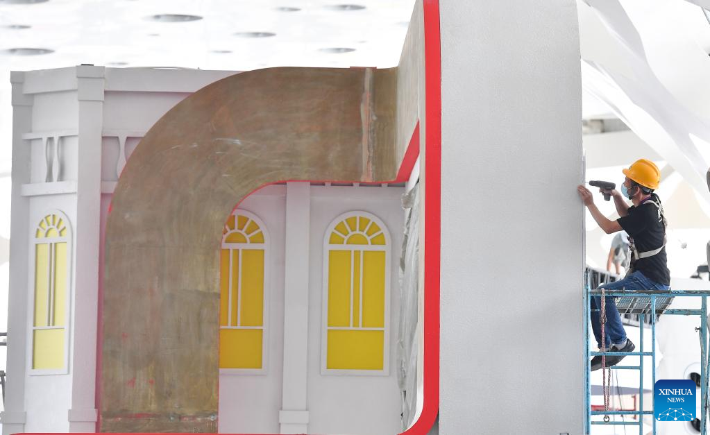A worker sets up exhibition booth at the Hainan International Convention and Exhibition Center, the venue for the 2nd China International Consumer Products Expo, in Haikou, south China's Hainan Province, July 19, 2022. The expo will be held in Haikou from July 26 to 30. The number of firms attending the expo will exceed last year's figure, with the exhibition area expanding to 100,000 square meters from 80,000 square meters.
