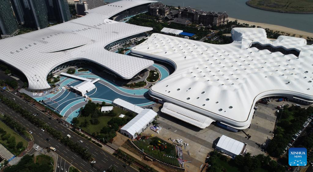 Aerial photo taken on July 19, 2022 shows a view outside the Hainan International Convention and Exhibition Center, the venue for the 2nd China International Consumer Products Expo, in Haikou, south China's Hainan Province. The expo will be held in Haikou from July 26 to 30. The number of firms attending the expo will exceed last year's figure, with the exhibition area expanding to 100,000 square meters from 80,000 square meters.