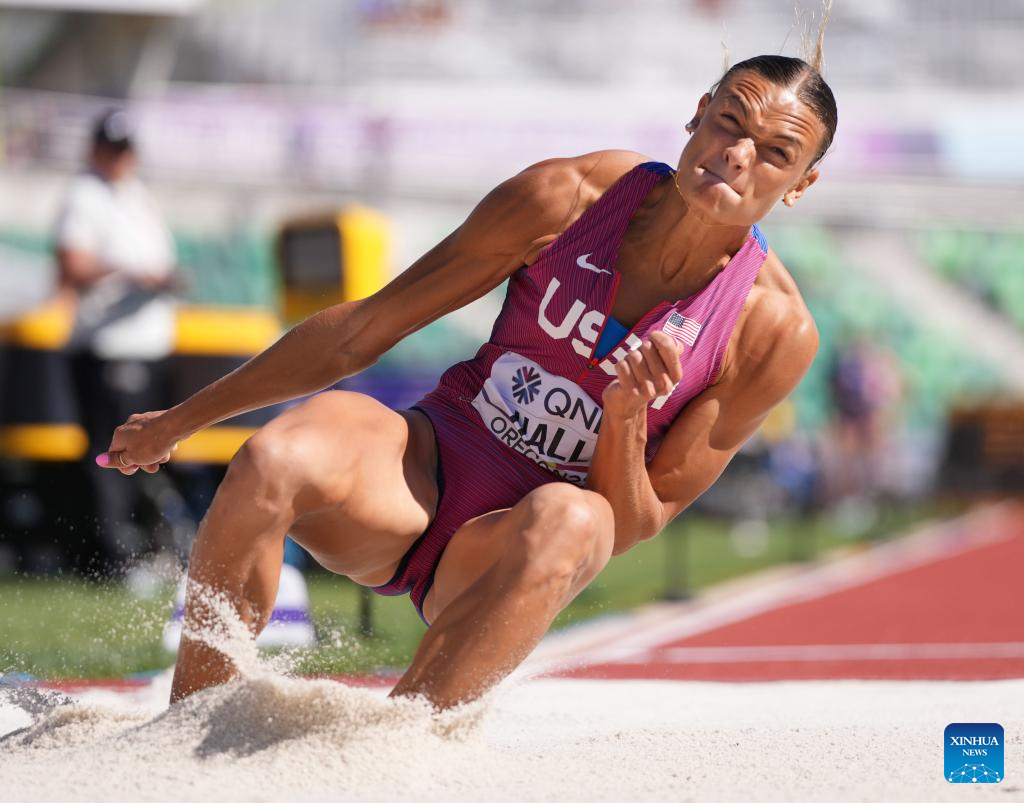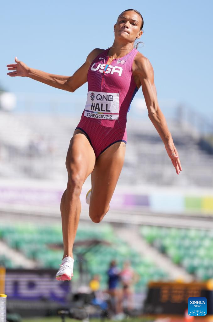 Anna Hall of the United States competes during the long jump event of women's heptathlon at the World Athletics Championships Oregon22 in Eugene, Oregon, the United States, July 18, 2022. (Xinhua/Wu Xiaoling)
