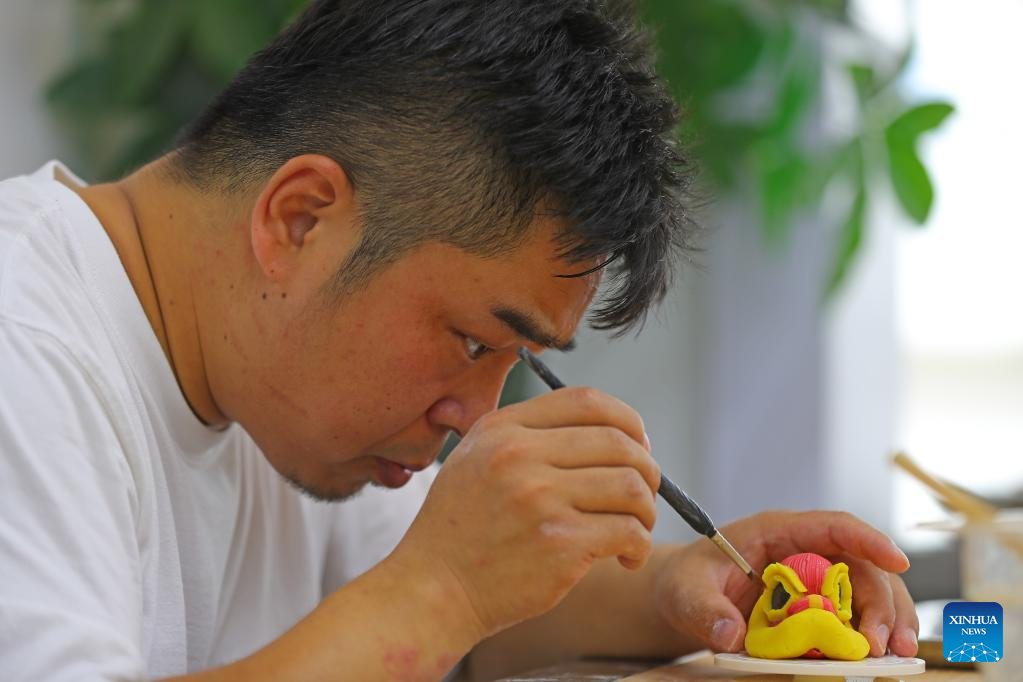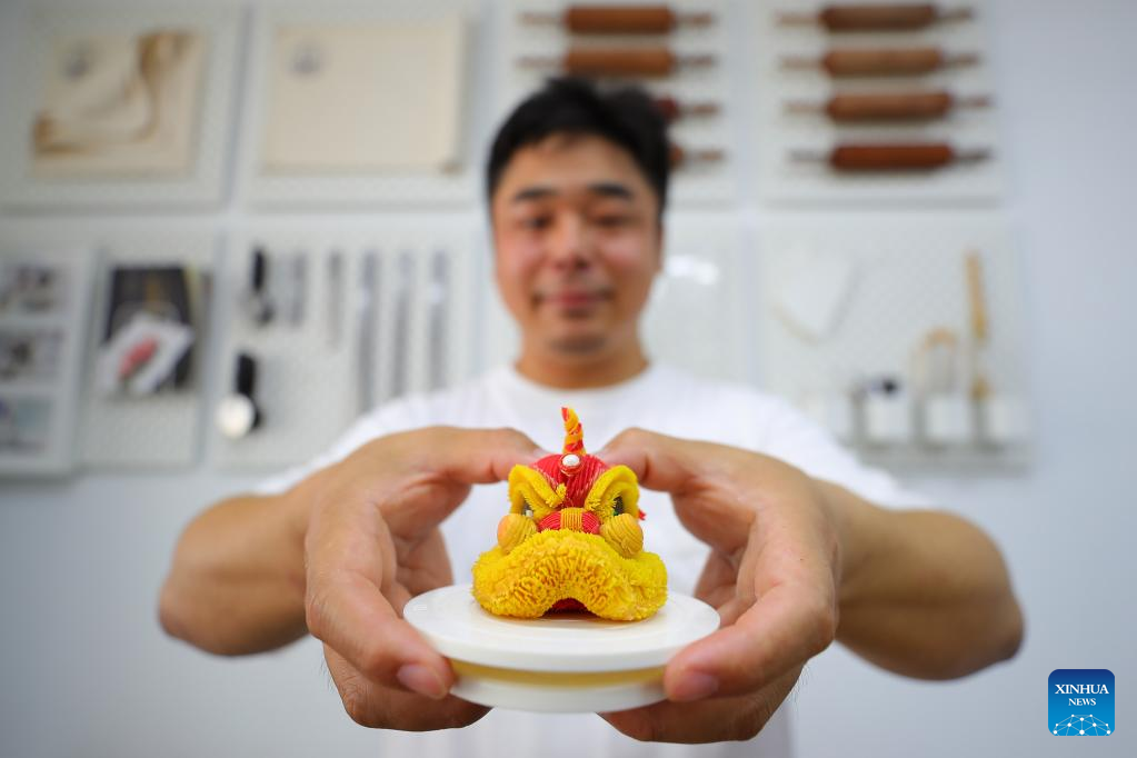 Chef Wu Yang shows a lion-shaped pastry he made at his studio in Shenyang, capital of northeast China's Liaoning Province, July 14, 2022. Wu Yang, a 35-year-old chef, has made pastry for ten years. Inspired by traditional Chinese culture, he has created various pastries with vivid shapes at his studio. (Xinhua/Yang Qing)
