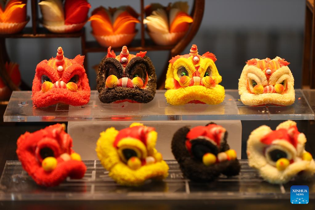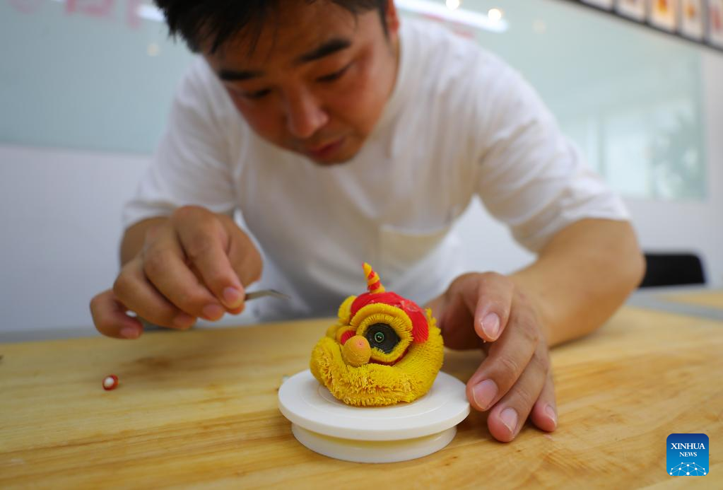 Photo taken on July 14, 2022 shows lion-shaped pastries made by chef Wu Yang in Shenyang, capital of northeast China's Liaoning Province. Wu Yang, a 35-year-old chef, has made pastry for ten years. Inspired by traditional Chinese culture, he has created various pastries with vivid shapes at his studio. (Xinhua/Yang Qing)