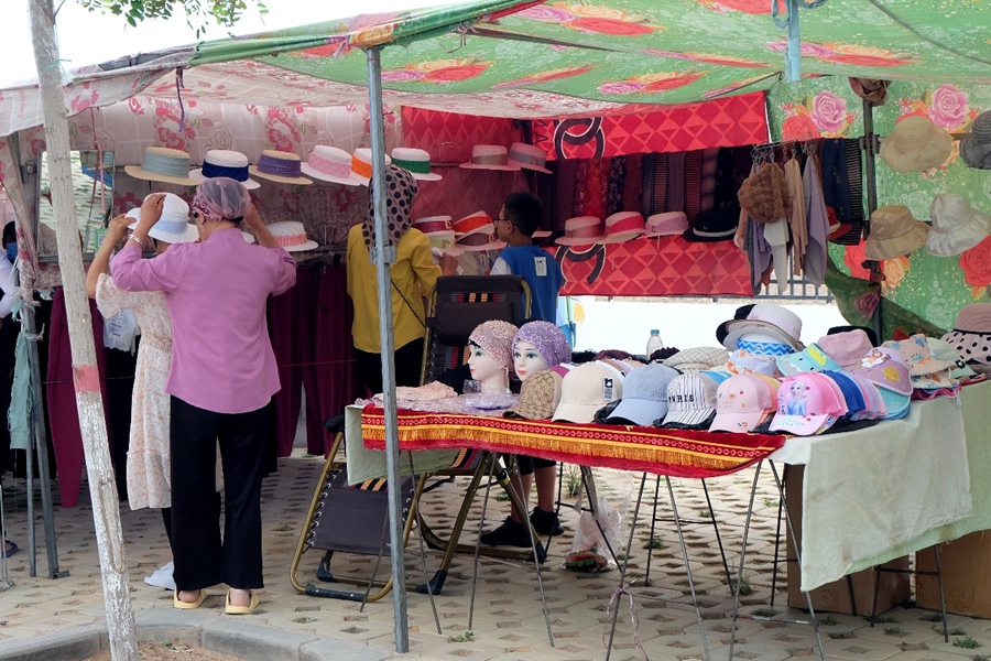 People try hats at a street market in Yuanlong Village of Minning Township, Yongning County, Yinchuan, northwest China's Ningxia Hui Autonomous Region on July 8, 2022. (People’s Daily Online/Zhong Wenxing)