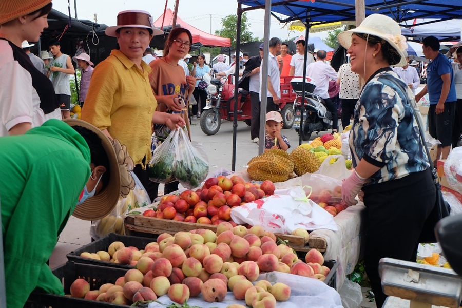 Residents select fresh fruits at a street market in Yuanlong Village of Minning Township, Yongning County, Yinchuan, northwest China's Ningxia Hui Autonomous Region on July 8, 2022. (People’s Daily Online/Zhong Wenxing)