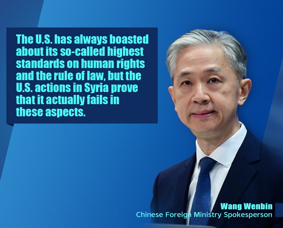 Wang said the United States has always boasted about its so-called highest standards on human rights and the rule of law, but the U.S. actions in Syria prove that it actually fails in these aspects.