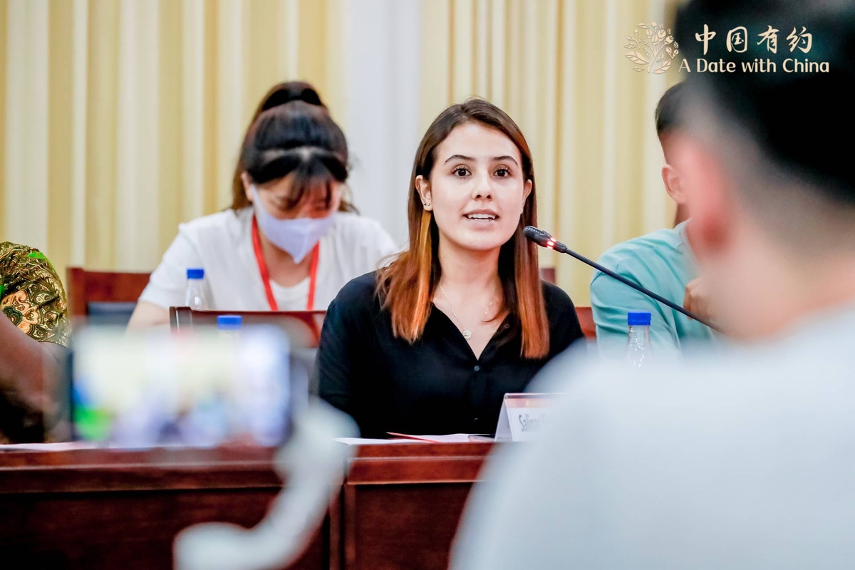 Salinas Fierro Ruth Camila, a student from Ecuador, speaks at a meeting with participants of the "A Date with China" 2022 international media tour as they visit Xiamen University, July 18, 2022. [Photo/chinadaily.com.cn]