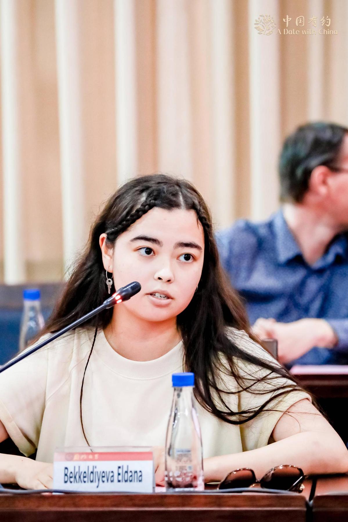 Bekkeldiyeva Eldana, a student from Kazakhstan, speaks at a meeting with participants of the "A Date with China" 2022 international media tour as they visit Xiamen University, July 18, 2022. [Photo/chinadaily.com.cn]
