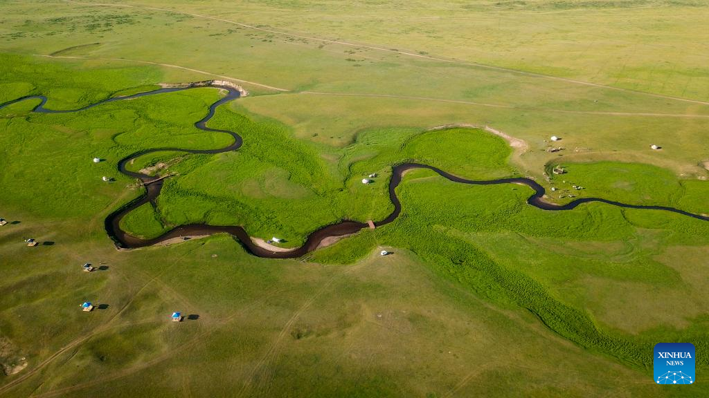 Aerial photo taken on July 19, 2022 shows a river in the grassland in West Ujimqin Banner of Xilingol League, north China's Inner Mongolia Autonomous Region. (Xinhua/Peng Yuan)