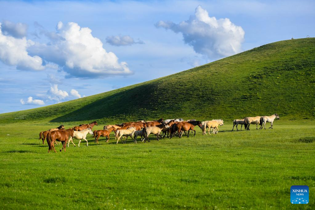 A herd of horses forage on the grassland in West Ujimqin Banner of Xilingol League, north China's Inner Mongolia Autonomous Region, July 19, 2022. (Xinhua/Peng Yuan)