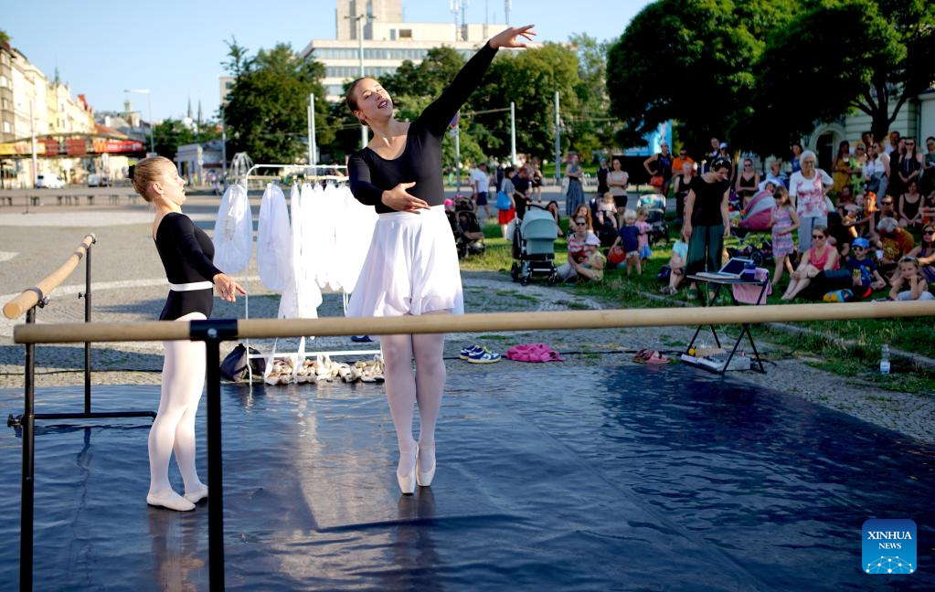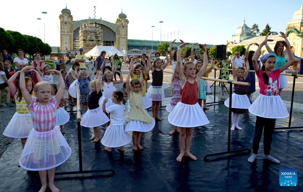Children learn ballet at a workshop during the 14th Prague Street Theater Festival in Prague, the Czech Republic, July 19, 2022. The week-long festival, which saw more than 40 performances by artists from several countries, closed Tuesday in the Czech capital. (Photo by Dana Kesnerova/Xinhua)