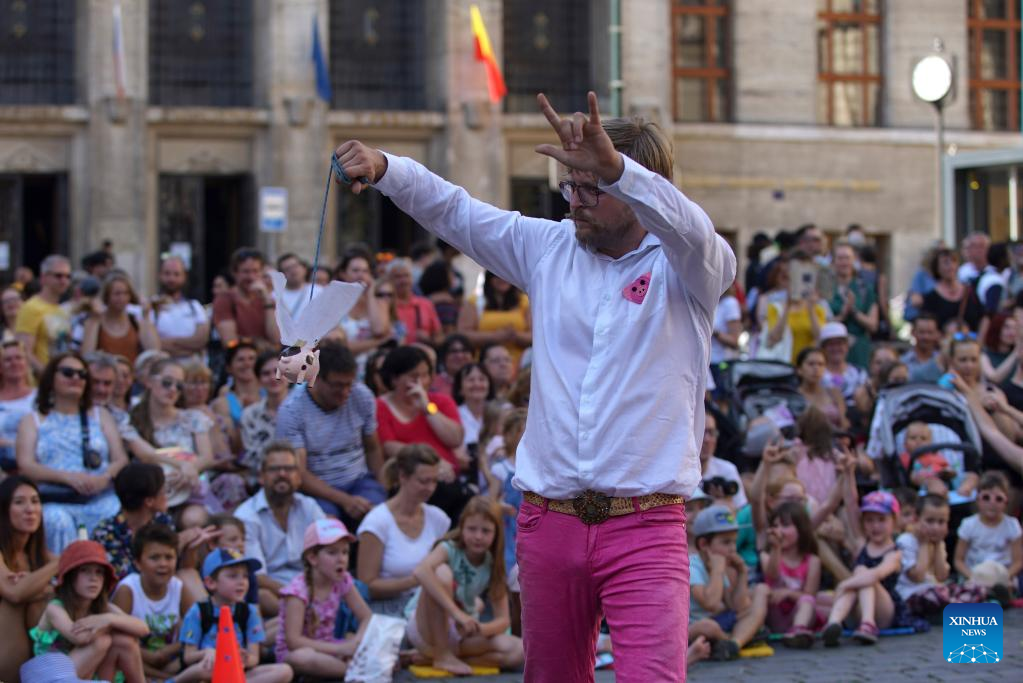 An artist performs during the 14th Prague Street Theater Festival in Prague, the Czech Republic, July 19, 2022. The week-long festival, which saw more than 40 performances by artists from several countries, closed Tuesday in the Czech capital. (Photo by Dana Kesnerova/Xinhua)
