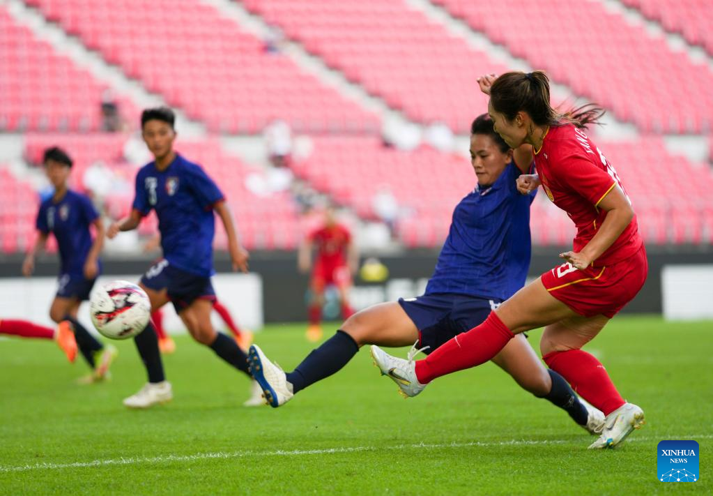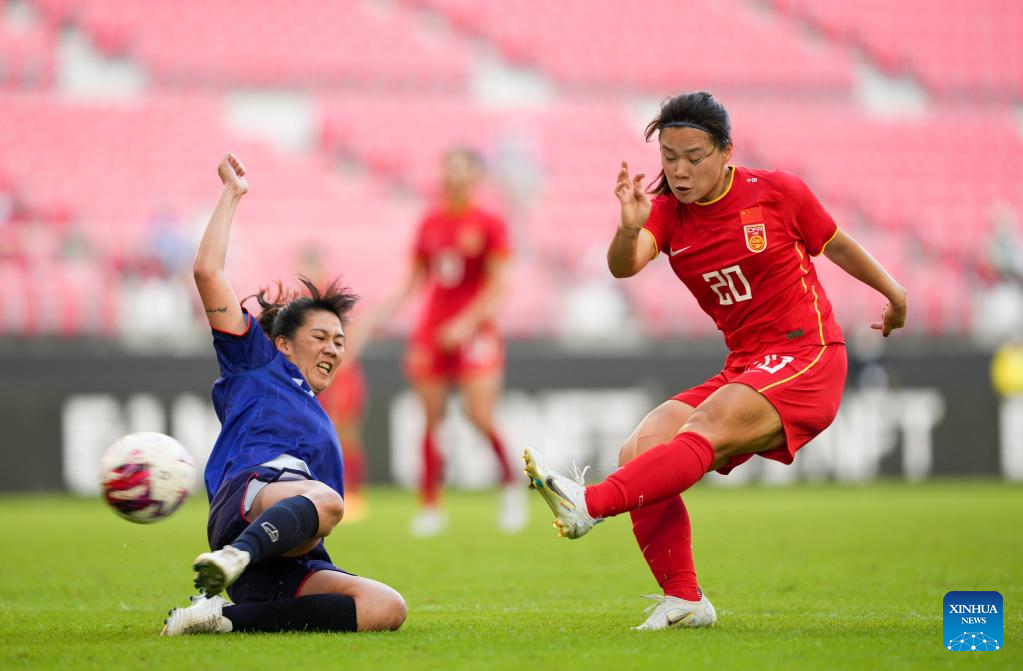 Xiao Yuyi (R) of China shoots during the 2022 EAFF (East Asian Football Federation) E-1 Football Championship women's match between China and Chinese Taipei at Toyota Stadium in Toyota City in Aichi prefecture, Japan, July 20, 2022. (Xinhua/Zhang Xiaoyu)