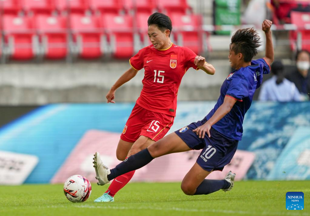 Wu Chengshu (L) of China vies with Lin Ya Han of Chinese Taipei during the 2022 EAFF (East Asian Football Federation) E-1 Football Championship women's match between China and Chinese Taipei at Toyota Stadium in Toyota City in Aichi prefecture, Japan, July 20, 2022. (Xinhua/Zhang Xiaoyu)