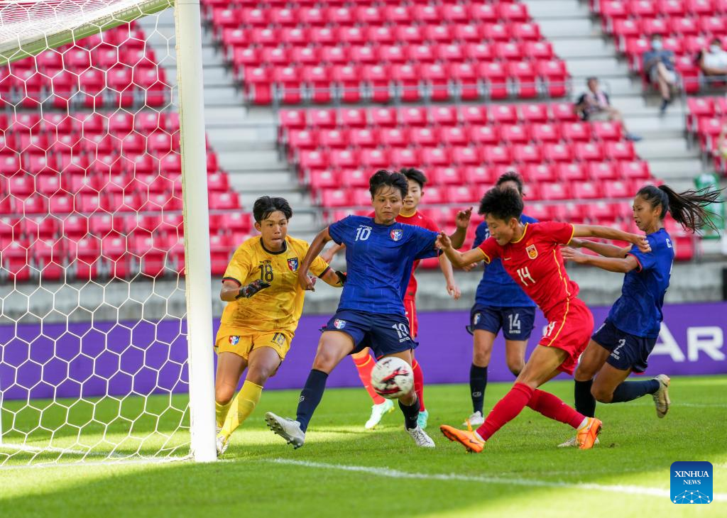 Lou Jiahui (2nd R) of China shoots during the 2022 EAFF (East Asian Football Federation) E-1 Football Championship women's match between China and Chinese Taipei at Toyota Stadium in Toyota City in Aichi prefecture, Japan, July 20, 2022. (Xinhua/Zhang Xiaoyu)