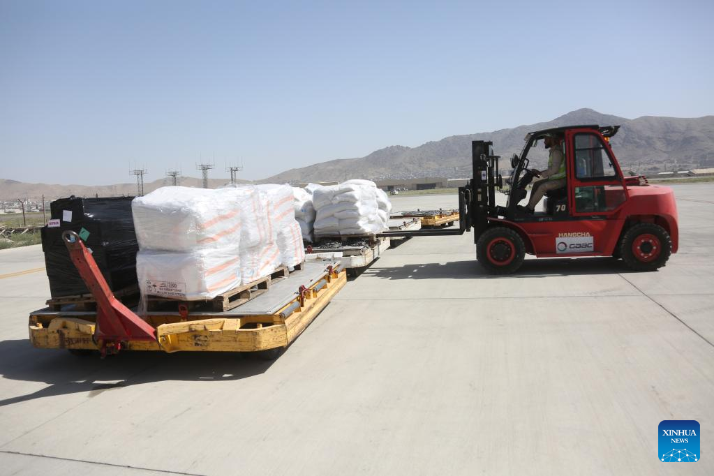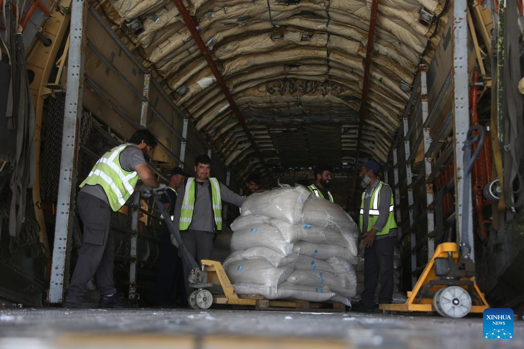 Workers unload Russian humanitarian aid supplies in Kabul, Afghanistan, on July 20, 2022. A Russian plane carrying 23.5 tons of humanitarian aid supplies landed at Kabul International Airport on Wednesday. (Photo by Saifurahman Safi/Xinhua)