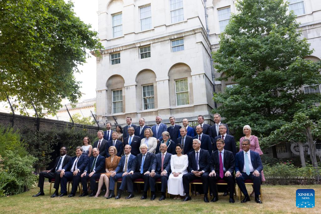 Outgoing British Prime Minister Boris Johnson (C, front) and members of the Cabinet pose for a group photo in the garden of 10 Downing Street in London, Britain, July 19, 2022. (Simon Dawson/No. 10 Downing Street/Handout via Xinhua)