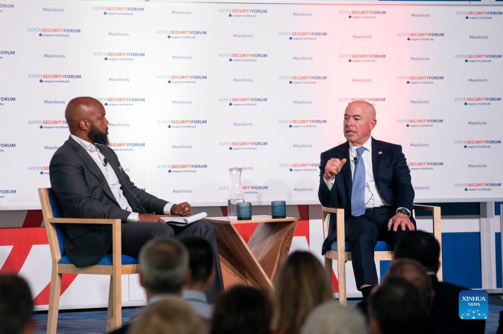 U.S. Secretary of Homeland Security Alejandro Mayorkas (R) speaks during a discussion of the Aspen Security Forum in Aspen, Colorado, the United States on July 19, 2022. Calling divisiveness one of the many threats facing the United States, Mayorkas on Tuesday blamed the growing divide on the unprecedented high degree of tolerance for hate in the country. (Xinhua/Liu Jie)