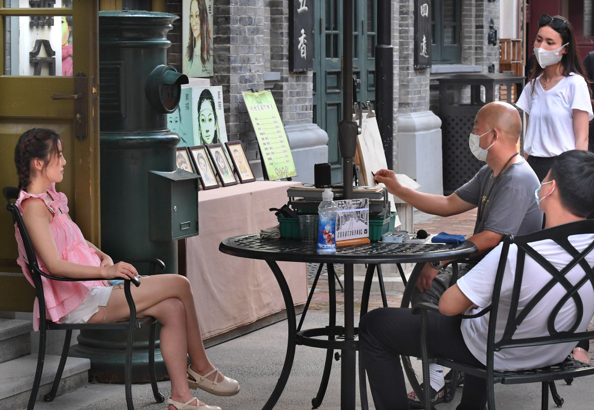 A painter sketches a portrait for a girl at a film town in Zhongmu county of Zhengzhou, Henan province on July 18. [Photo/Xinhua]