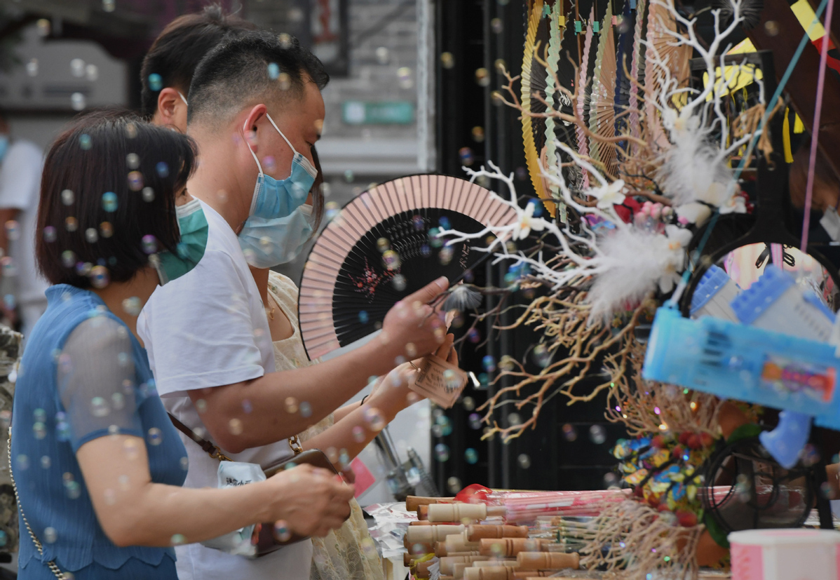 Tourists buy goods at a film town in Zhongmu county of Zhengzhou, Henan province on July 18. [Photo/Xinhua]
