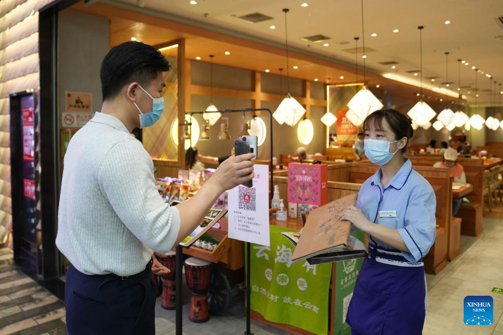 A customer shows his health code to a waitress before entering a restaurant in a shopping mall in Chaoyang district of Beijing, capital of China, June 6, 2022. [Photo/Xinhua]
