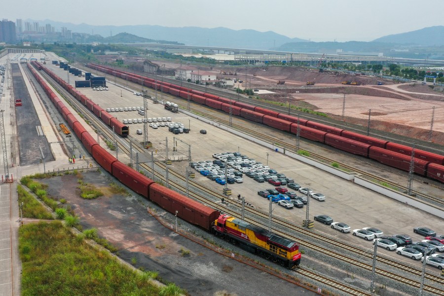 Cars produced by Changan Automobile are loaded onto a JSQ freight vehicle of China Railway Special Cargo Logistics Co., Ltd. at Yuzui Station in southwest China's Chongqing, July 21, 2022. (Xinhua/Tang Yi)