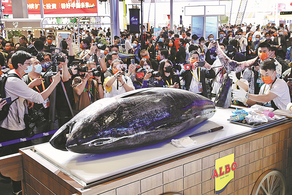 A 353-kilogram tuna attracts visitors to the expo. [Photo by ZHU XINGXIN/CHINA DAILY]
