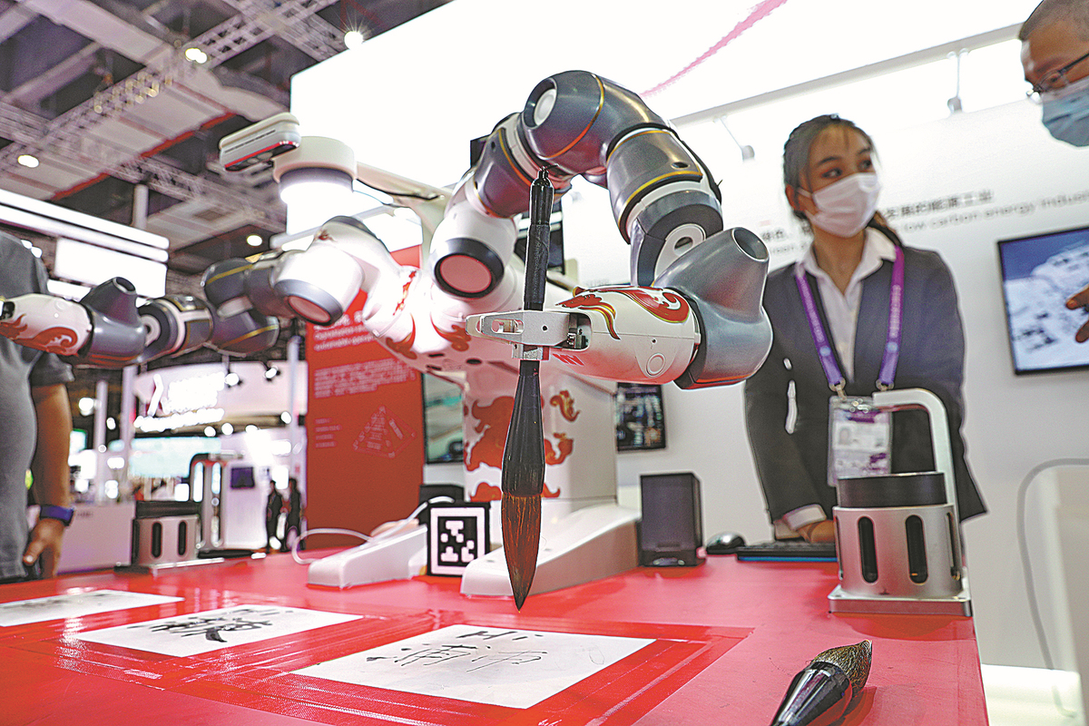 A robot writes Chinese calligraphy at the Shanghai expo last year. [Photo by XU CONGJUN/FOR CHINA DAILY]