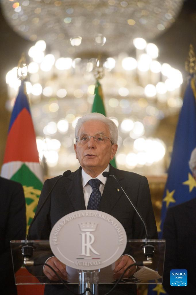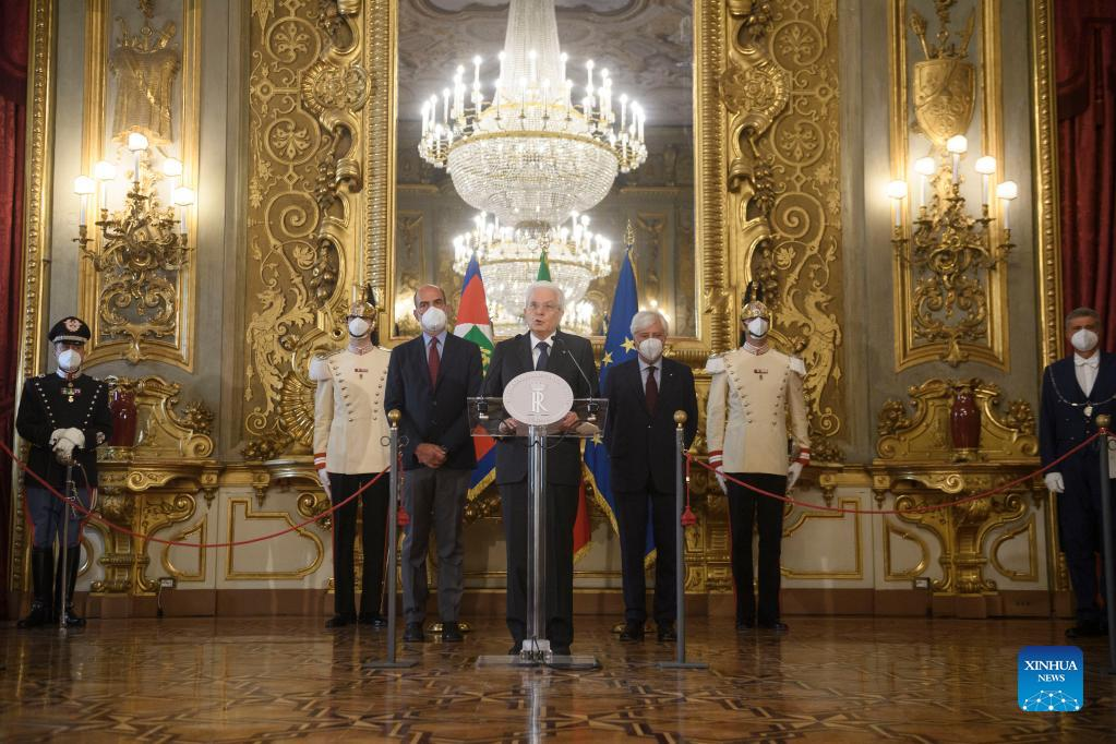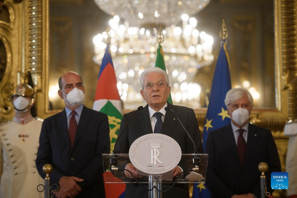 Italian President Sergio Mattarella (C) speaks at the Quirinale Palace in Rome, Italy, on July 21, 2022. Italian President Sergio Mattarella on Thursday officially dissolved the two chambers of parliament, opting for the constitutional procedure to hold early elections in the country. (Photo by Alberto Lingria/Xinhua)
