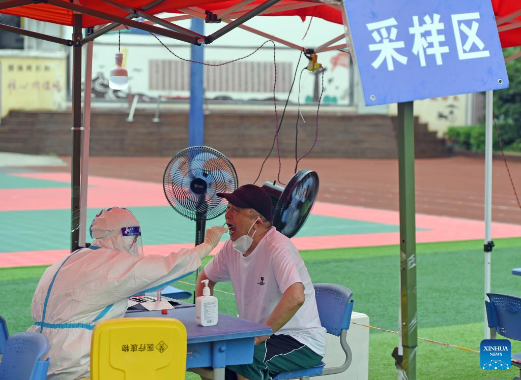 A medical worker takes a swab sample from a citizen for nucleic acid testing in Bengshan District of Bengbu City, east China's Anhui Province, July 16, 2022. (Xinhua/Zhou Mu)