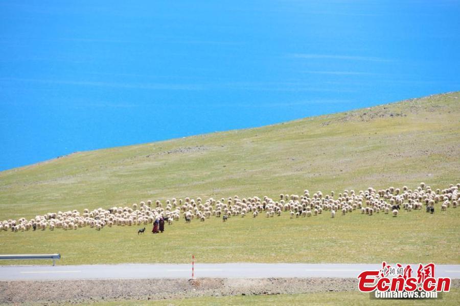 Herdsmen herd their sheep by a lake on Qiangtang Grassland at Baingoin County of Naqu in southwest China's Tibet Autonomous Region. (Photo/China News Service)