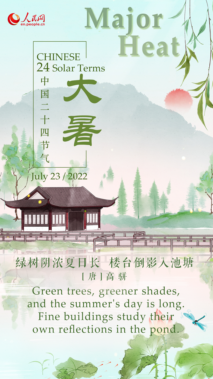 Major Heat or Dashu in Chinese, is the 12th solar term, whose arrival symbolizes that most parts of China have entered the hottest season of the year. In classical Chinese, the character "Shu" was compared to "boiling," delivering an image that the earth is like a pot of boiling water during this time period.