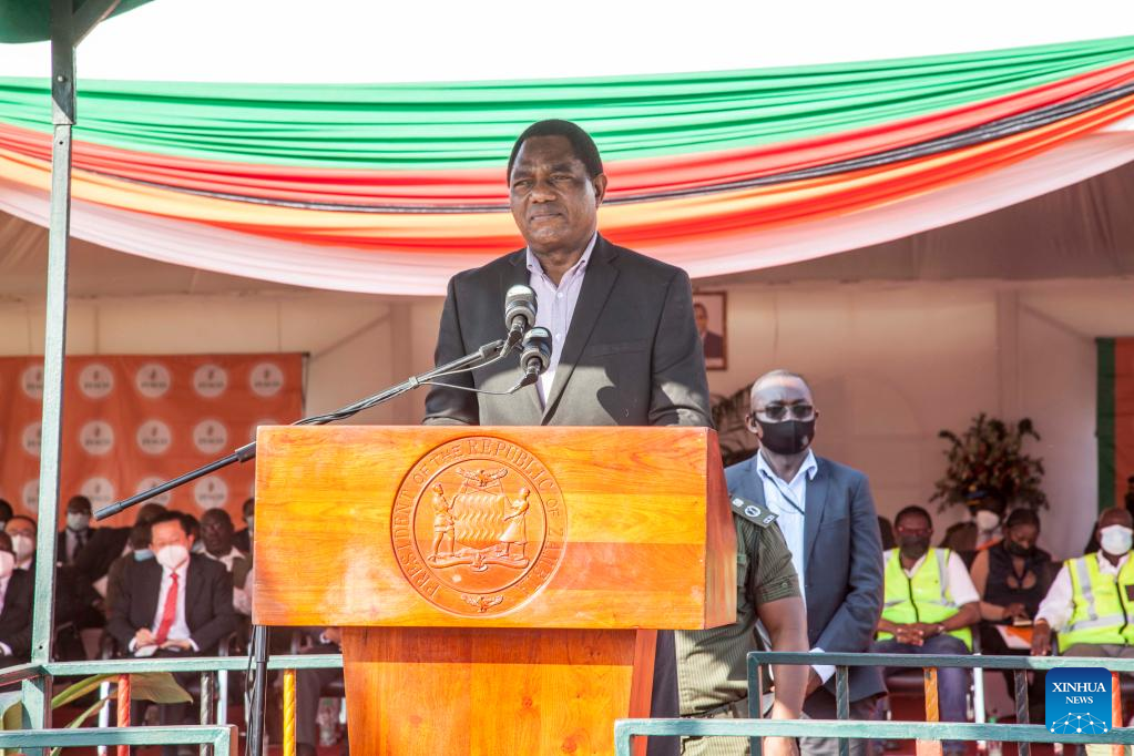 Zambian President Hakainde Hichilema speaks after touring the Kafue Lower Gorge Power Station in Southern Province, Zambia, July 21, 2022. Hichilema on Thursday toured the Kafue Lower Gorge Power Station, a Chinese-built hydropower plant.