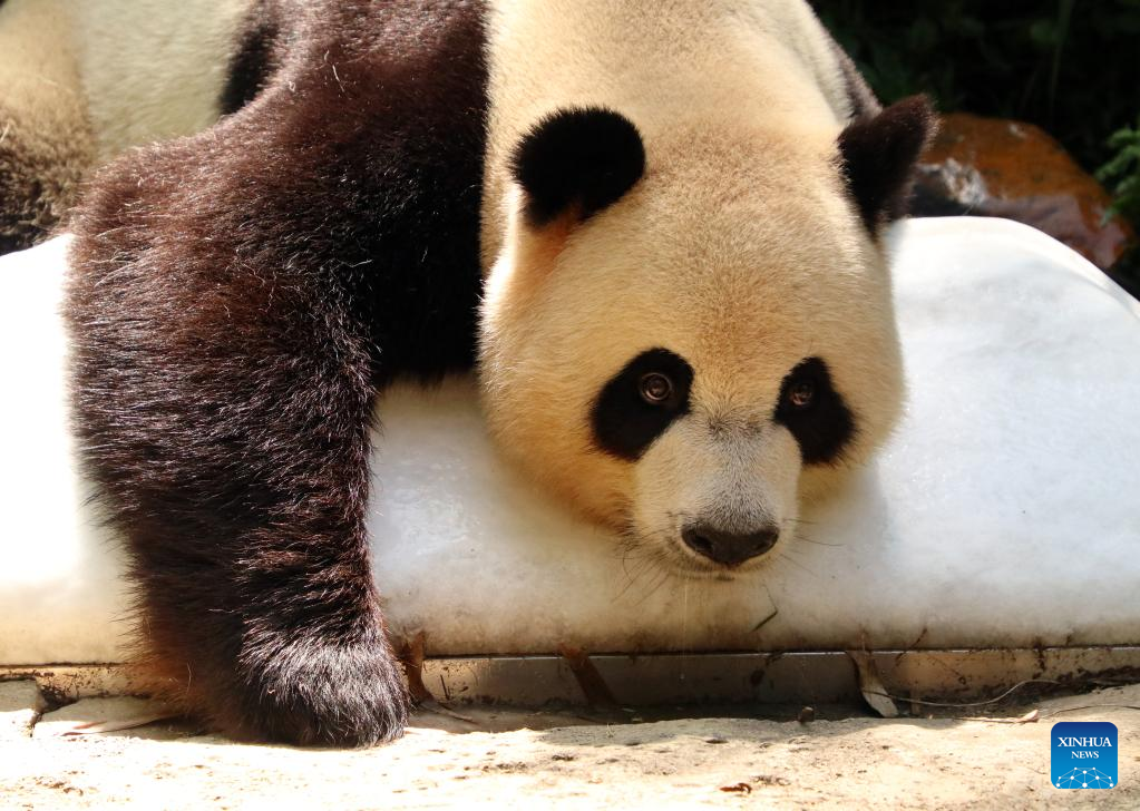 Giant panda Shuaishuai lies on an ice cube at Chimelong Safari Park in Guangzhou, south China's Guangdong Province, July 22, 2022. The zoo tries every means to help animals fend off the summer heat in recent days. (Xinhua/Huang Guobao)
