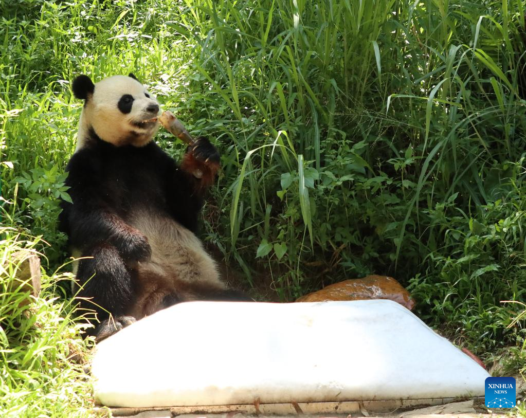 Giant panda Shuaishuai eats beside an ice cube at Chimelong Safari Park in Guangzhou, south China's Guangdong Province, July 22, 2022. The zoo tries every means to help animals fend off the summer heat in recent days. (Xinhua/Huang Guobao)