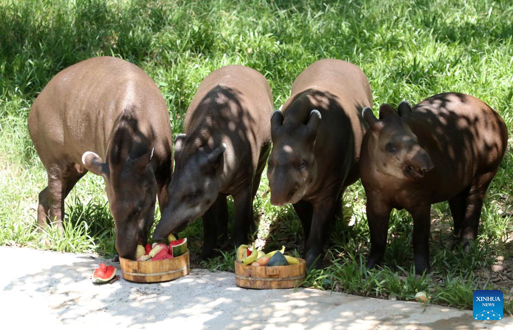 Brazilian Tapirs eat fruits at Chimelong Safari Park in Guangzhou, south China's Guangdong Province, July 22, 2022. The zoo tries every means to help animals fend off the summer heat in recent days. (Xinhua/Huang Guobao)