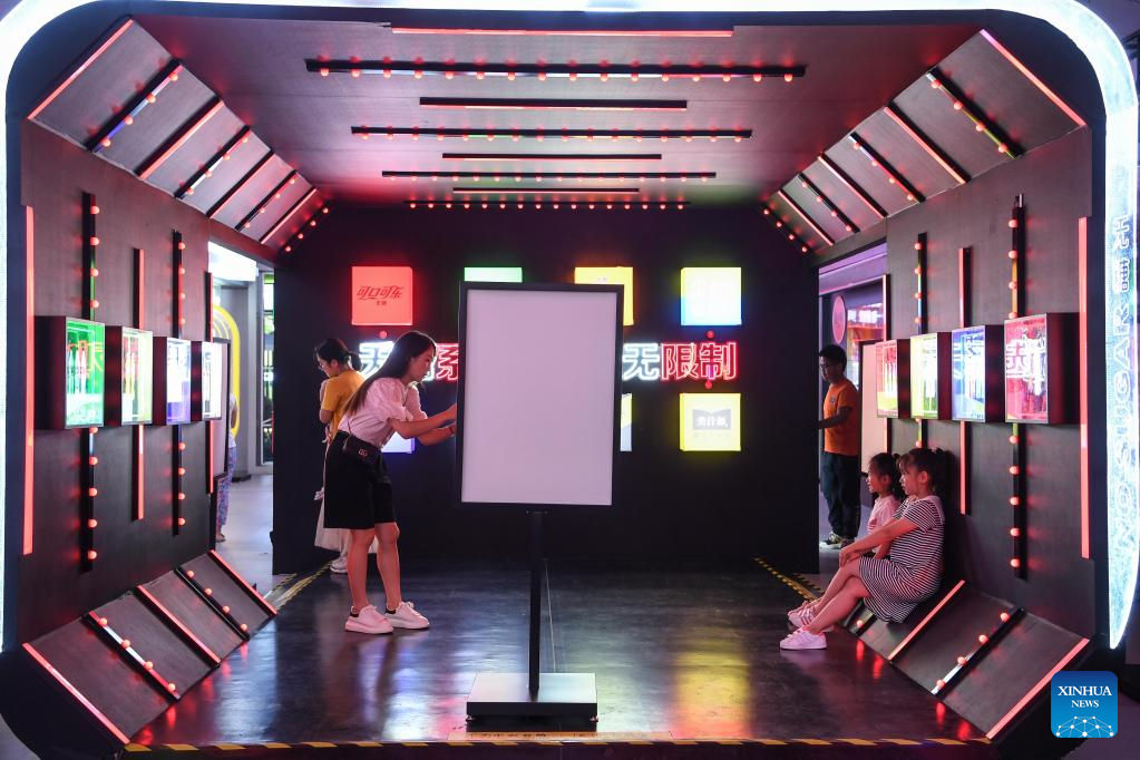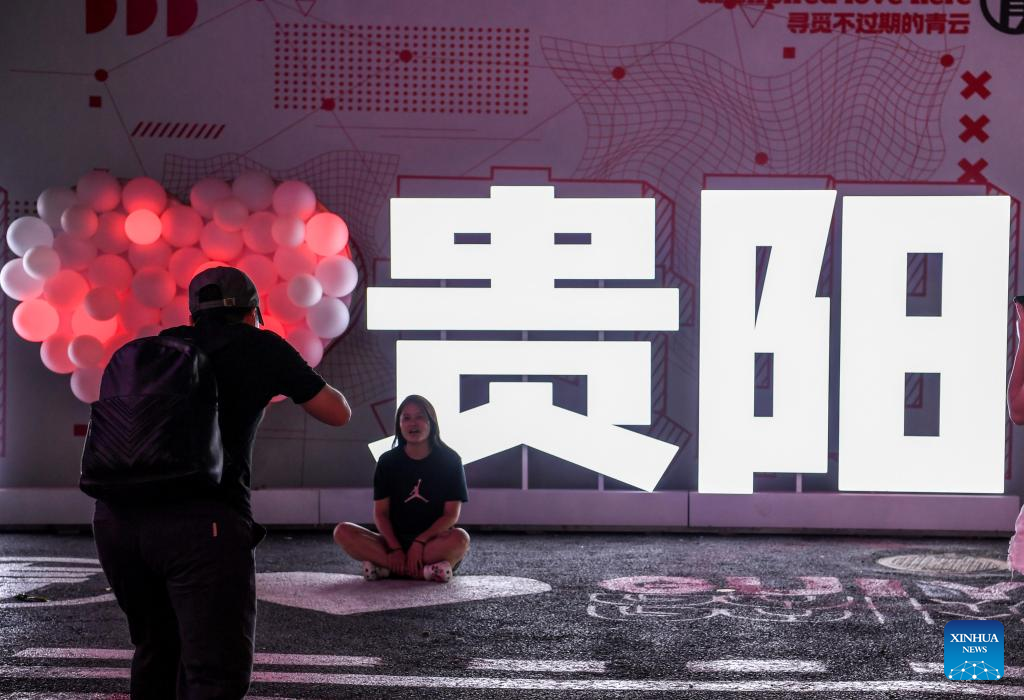 A visitor poses for photos at a local market at the Qingyun Road in Nanming District of Guiyang, capital city of southwest China's Guizhou Province, July 21, 2022.