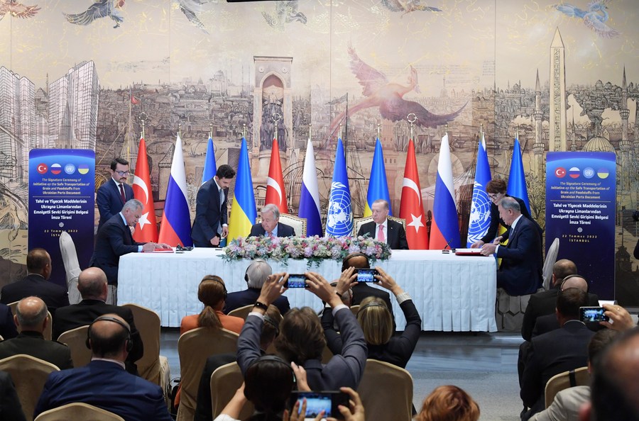 Russia and Ukraine are signing an agreement with Turkey and the United Nations on shipping Ukrainian grain, foodstuff, and fertilizer to international markets via the Black Sea in Istanbul, on July 22, 2022. (Xinhua/Shadati)