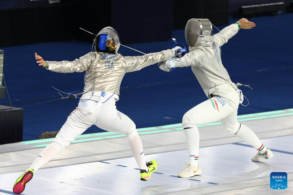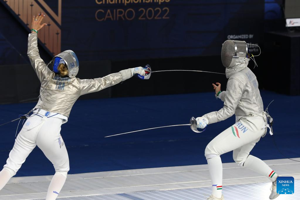 Sugar Katinka Battai (R) of Hungary competes against Caroline Queroli of France during the women's sabre team final at the 2022 Fencing World Championships in Cairo, Egypt, July 23, 2022. (Xinhua/Ahmed Gomaa)