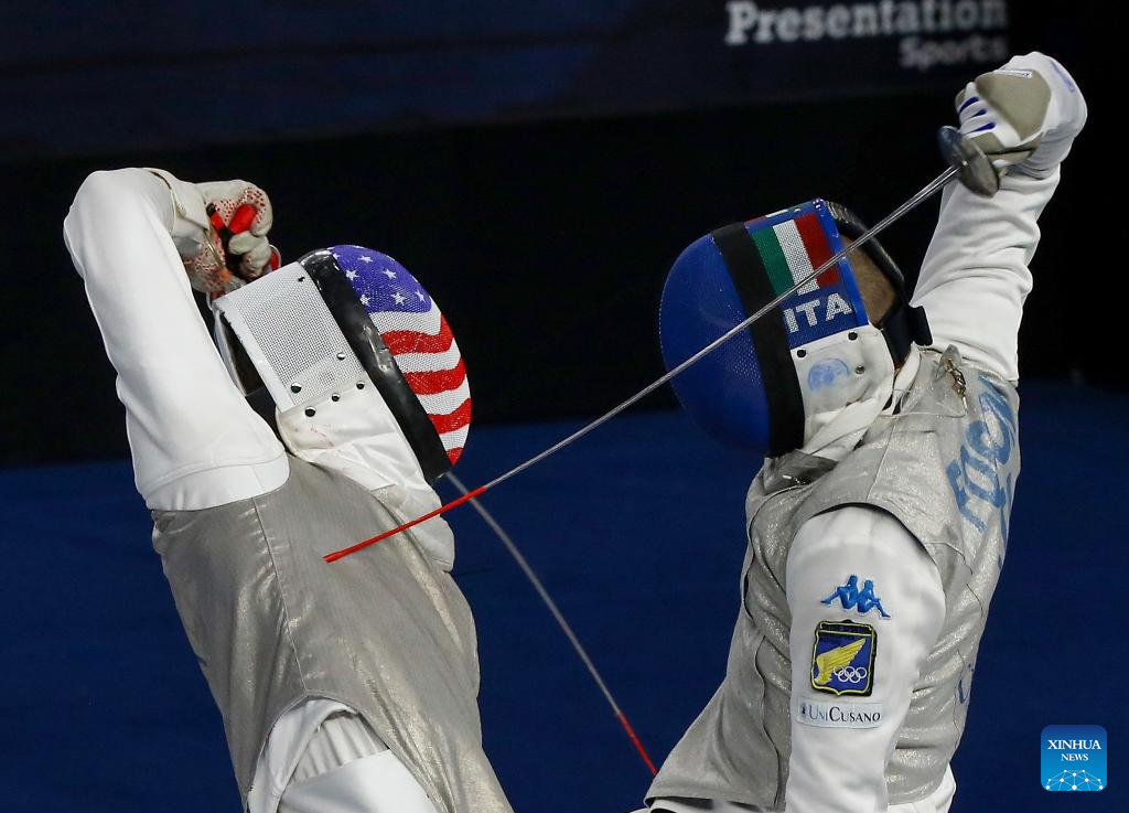 Alessio Foconi (R) of Italy competes against Nick Itkin of the United States during the men's foil team final at the 2022 Fencing World Championships in Cairo, Egypt, July 23, 2022. (Xinhua/Ahmed Gomaa)