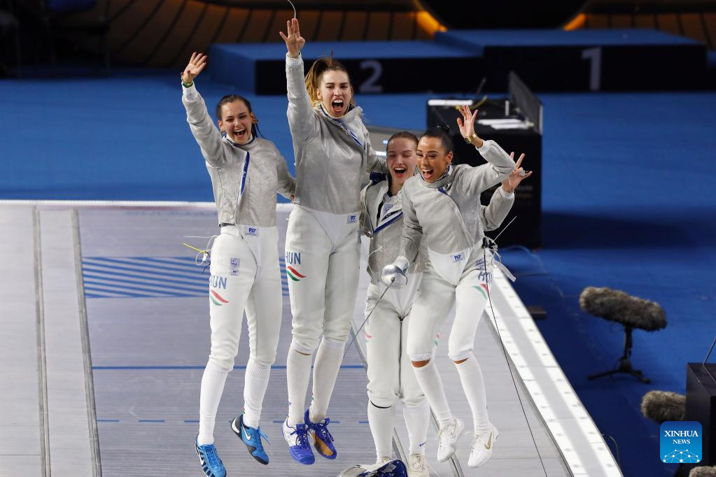 Fencers of Hungary celebrate after winning the women's sabre team final betwenn Hungary and France at the 2022 Fencing World Championships in Cairo, Egypt, July 23, 2022. (Xinhua/Ahmed Gomaa)