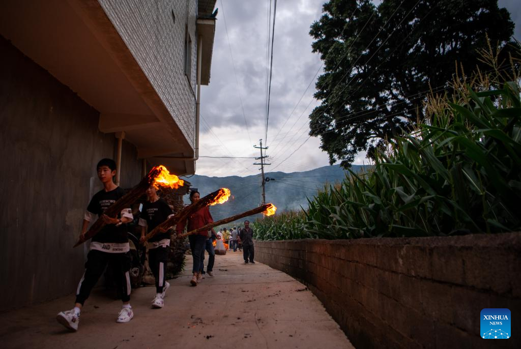 Villagers attend a celebration of a torch festival in Taiping Village in Nanjian Yi Autonomous County, southwest China's Yunnan Province, July 23, 2022. (Xinhua/Jiang Wenyao)