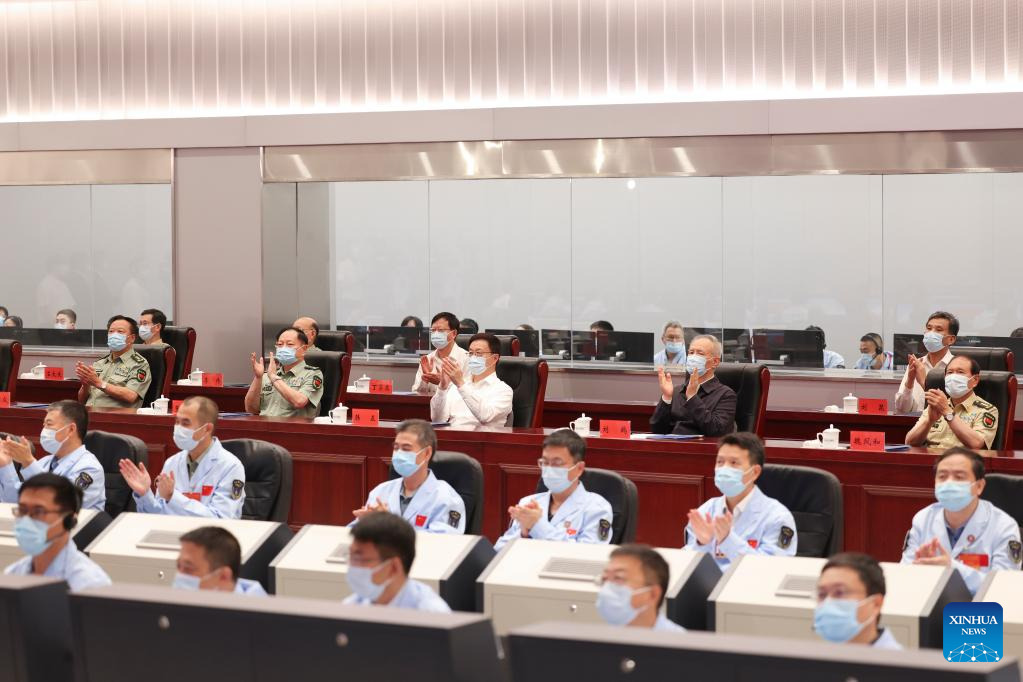 Chinese Vice Premier Han Zheng, also a member of the Standing Committee of the Political Bureau of the Communist Party of China Central Committee, watches the launch of Wentian, the first lab module of the country's space station, and extends warm greetings and congratulations to all those participating in the mission, at the Beijing Aerospace Control Center in Beijing, capital of China, July 24, 2022. China on Sunday launched Wentian from the Wenchang Spacecraft Launch Site on the coast of the southern island province of Hainan. The module has entered the planned orbit and the launch is a complete success. (Xinhua/Ding Haitao)